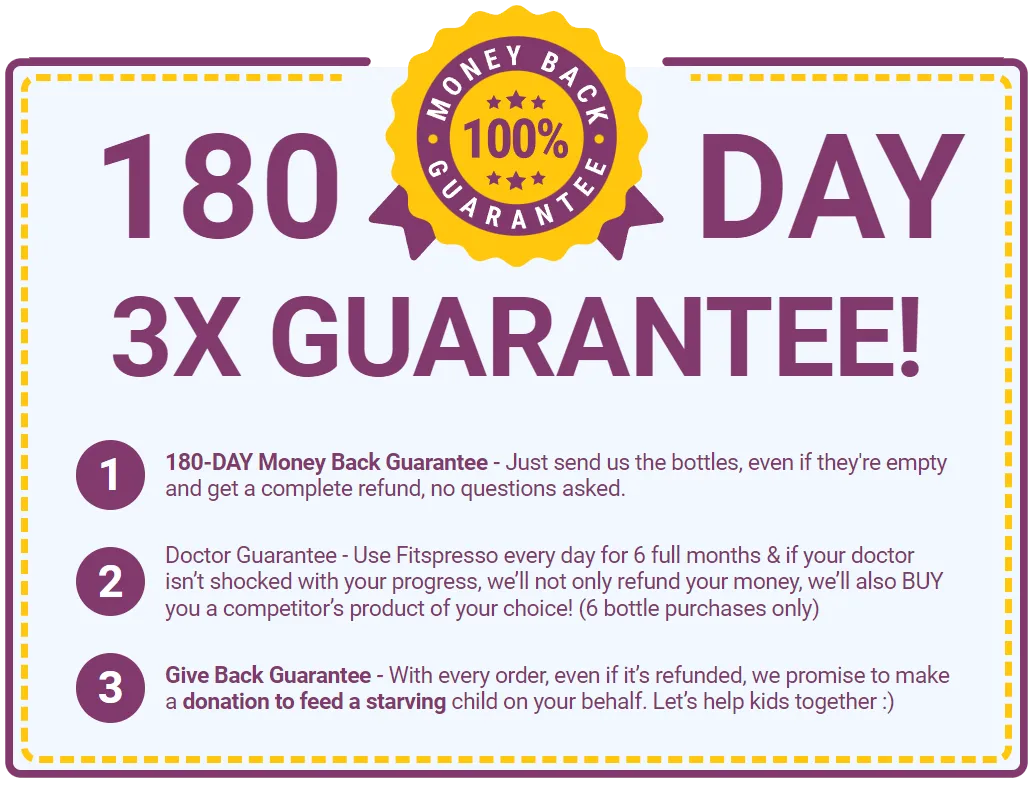 Use Fitspresso every day for 6 full months & if your doctor 2 isn’t shocked with your progress, we’ll not only refund your money, we’ll also BUY you a competitor’s product of your choice! (6 bottle purchases only).
